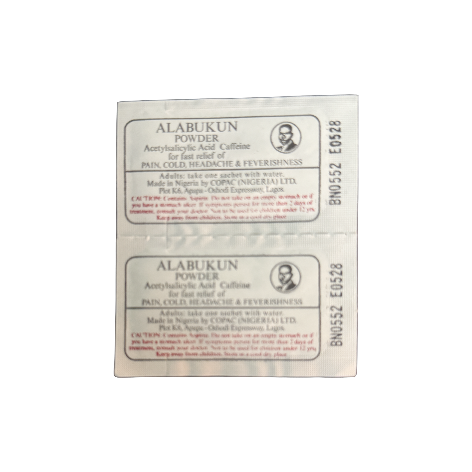 A staple in many African households, Alabukun Powder is a time-tested remedy used for the fast relief of headaches, migraines, fever, toothaches, and mild body pain. Each sachet contains a potent combination of acetylsalicylic acid (aspirin) and caffeine, formulated to act quickly and effectively.
